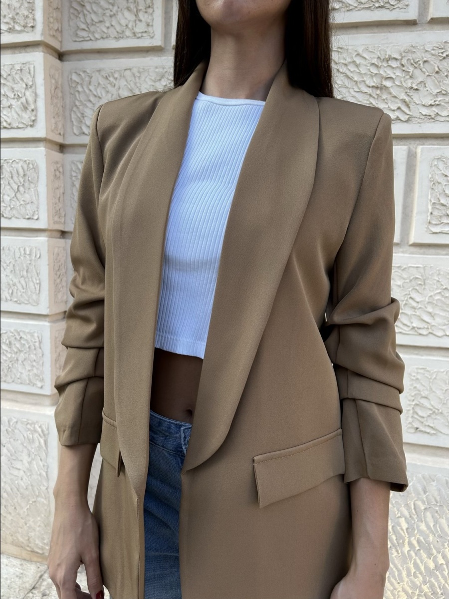 Blazer beige con maniche arrotolate. Doppiopetto senza bottoni