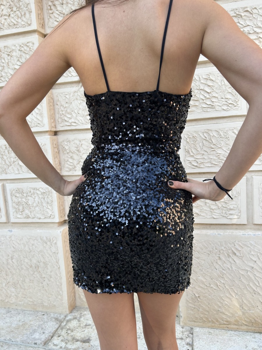 Completo nero con pailettes composto da minigonna e top con spalline sottili leggermente elasticizzati